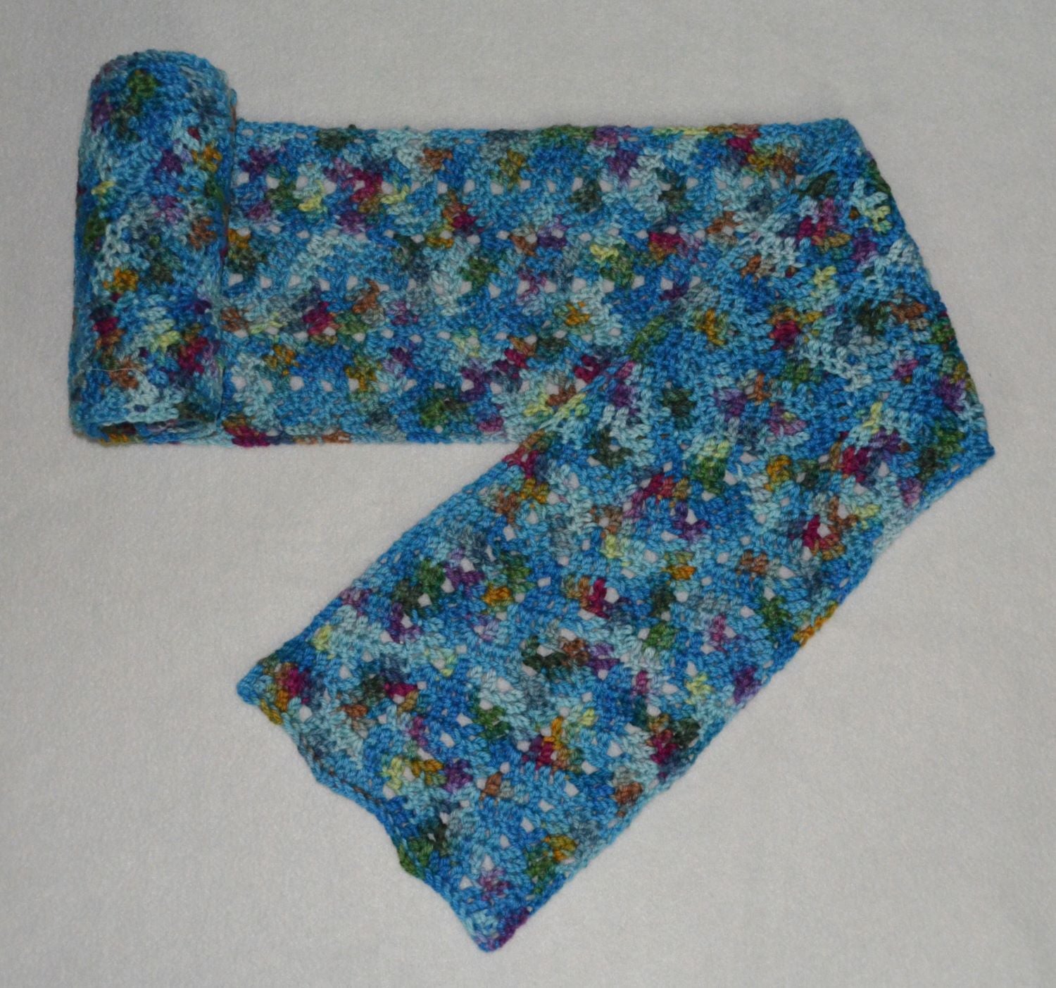Such a pretty crocheted scarf! And it drapes so beautifully. Measuring 6 inches wide and 60 inches long, it's both stylish and functional. The second photo is a closeup of the stitch pattern. Start wearing it once it's cool in the evening, and continue wearing it throughout winter. The multicolored yarn coordinates with almost anything in your wardrobe.