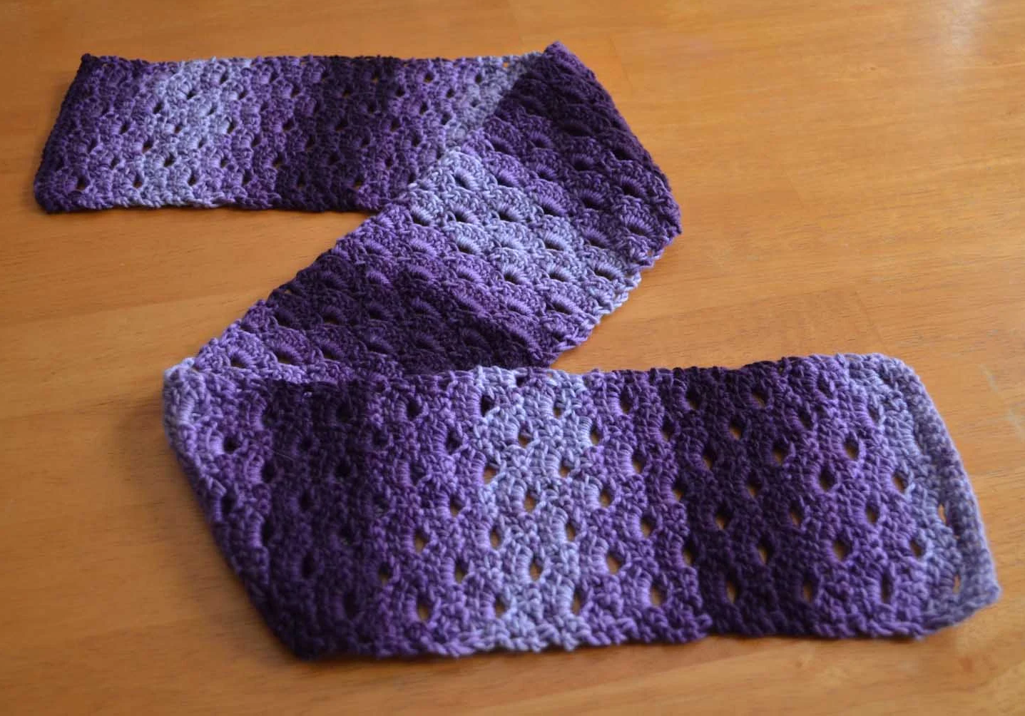 A clamshell-type crochet stitch was the idea behind this gorgeous purple decorative scarf. The color change, from dark to light, then back again, is just beautiful. This one’s not as much for warmth as it is for show! Scarf measures 5" x 35".