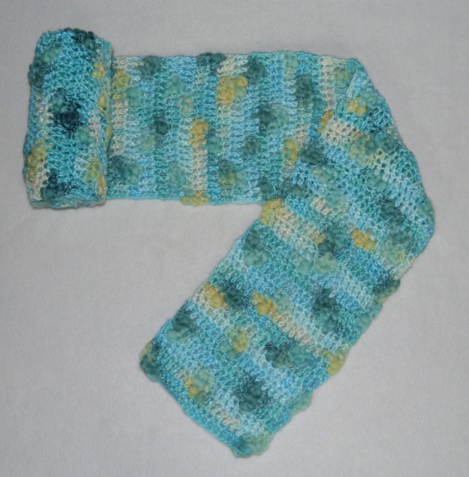 A thick-and-thin yarn, like the one used here, makes little 'dots' of fluff when crocheted. It's a great look, and feels good around your neck, too. Six inches wide, and 66 inches long, this scarf is plenty big enough to bulk around your neck and keep you toasty warm in the cold wind and snow. Don't you love how the yellow pops against those shades of teal?