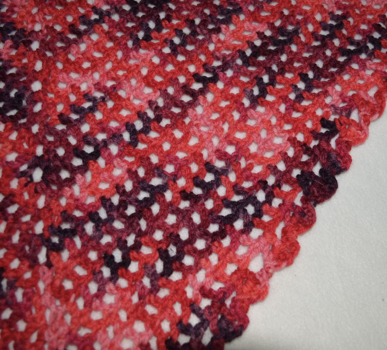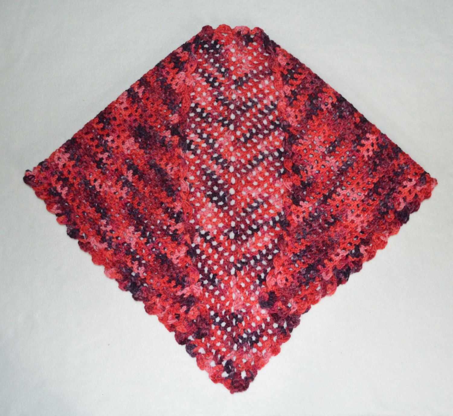 The reds in this shawl travel from a pale pink all the way to almost-black, and back again. Crocheted in an airy pattern, it's ideal for a chilly morning or evening. The second photo is a closeup for design detail. Shawl measures 47 inches from end to end, and 24 inches deep, to the point.