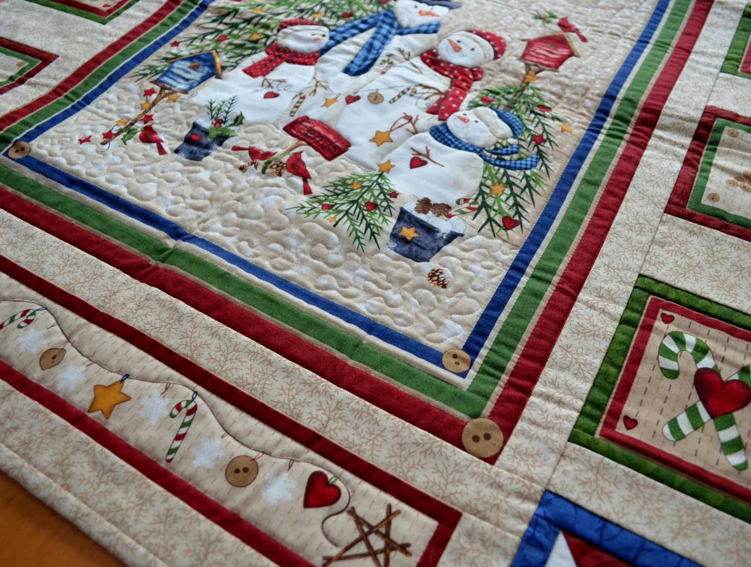 This whimsical winter piece started out as a simple fabric panel. With some careful cutting and a little planning, it became so much more! The piece measures approximately 27.5" x 28.5", and there is a sleeve attached for easy hanging. Made from high-quality quilting cottons and cotton batting, it's machine pieced and custom machine quilted.